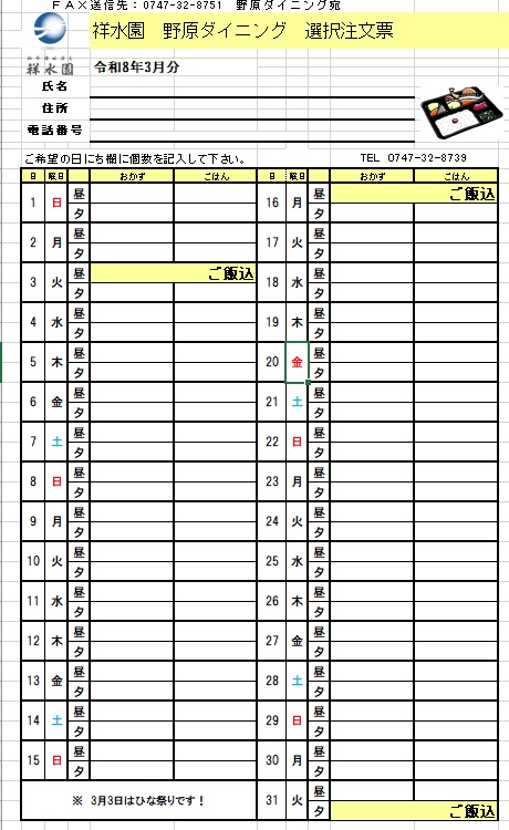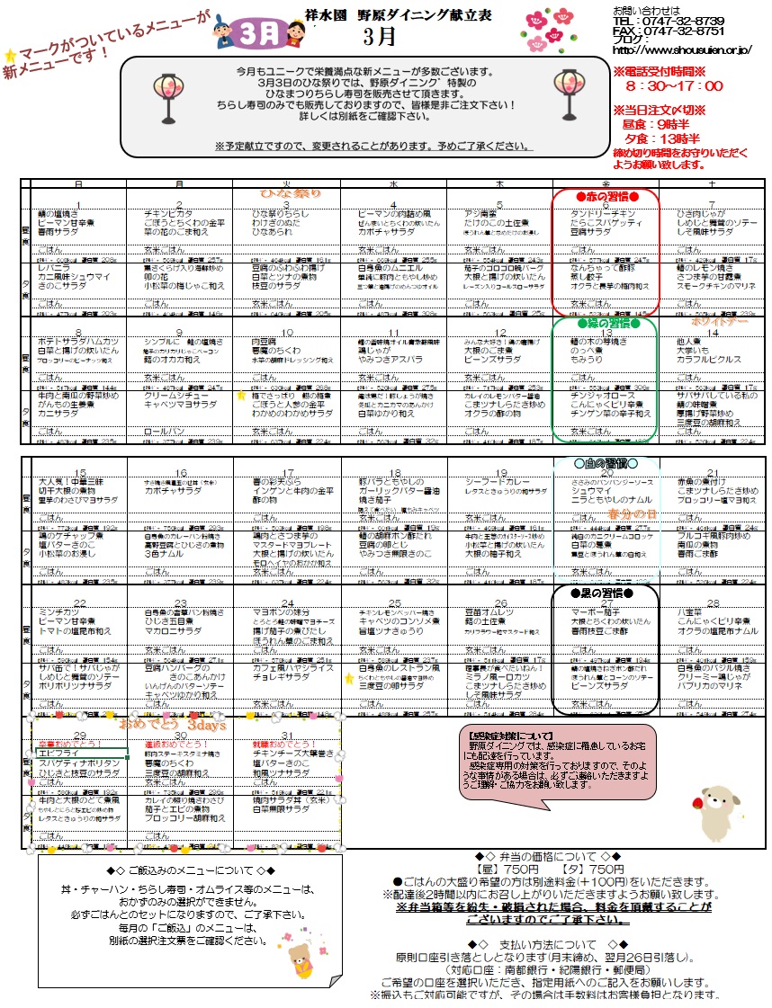 令和8年3月のメニューをお知らせいたします。